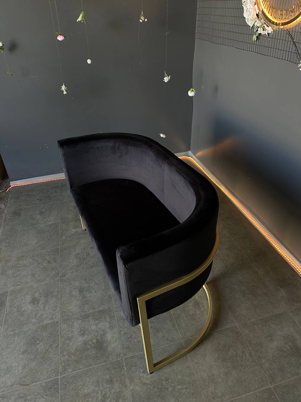 М’яка велюрова оббивка чорного кольору надає дивану преміального вигляду та приємна на дотик. Металеві ніжки золотого кольору створюють сучасний акцент і забезпечують стабільність конструкції.
