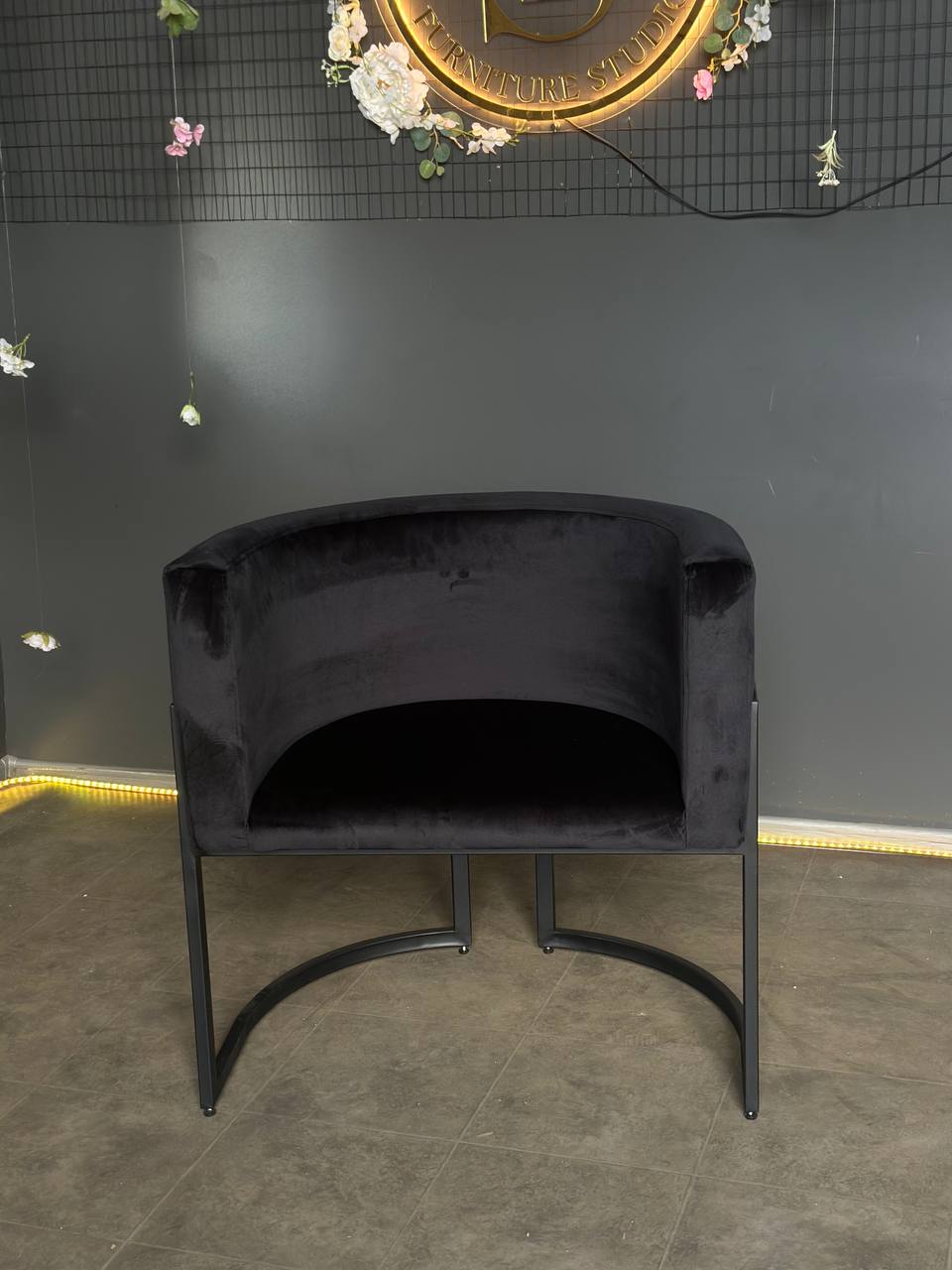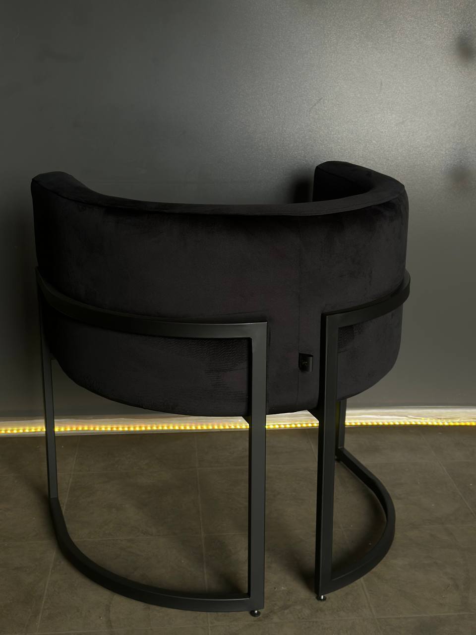 Стильне дизайнерське крісло Loft Oval з м’якою велюровою оббивкою чорного кольору та металевим каркасом. Ергономічна форма забезпечує комфортну посадку і сучасний вигляд.