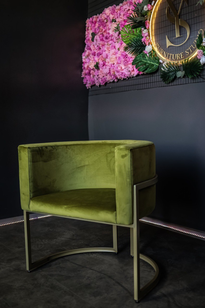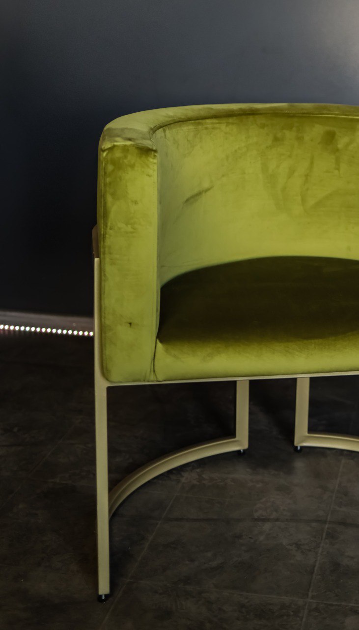 Дизайнерське крісло Loft Oval з м’якою велюровою оббивкою зеленого кольору та металевим каркасом. Стильне та комфортне рішення для сучасних інтер’єрів, салонів краси, кафе або офісів.