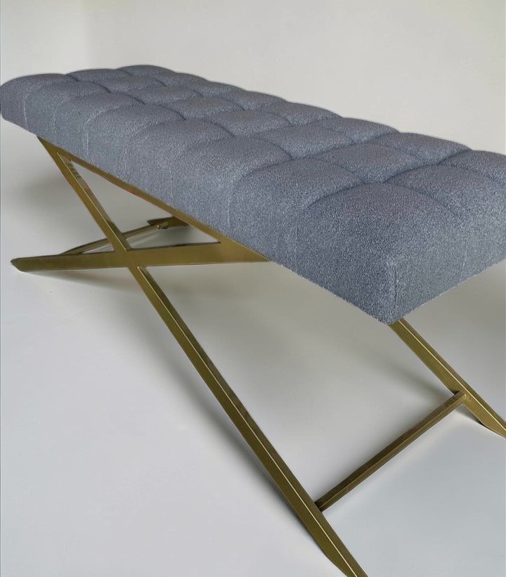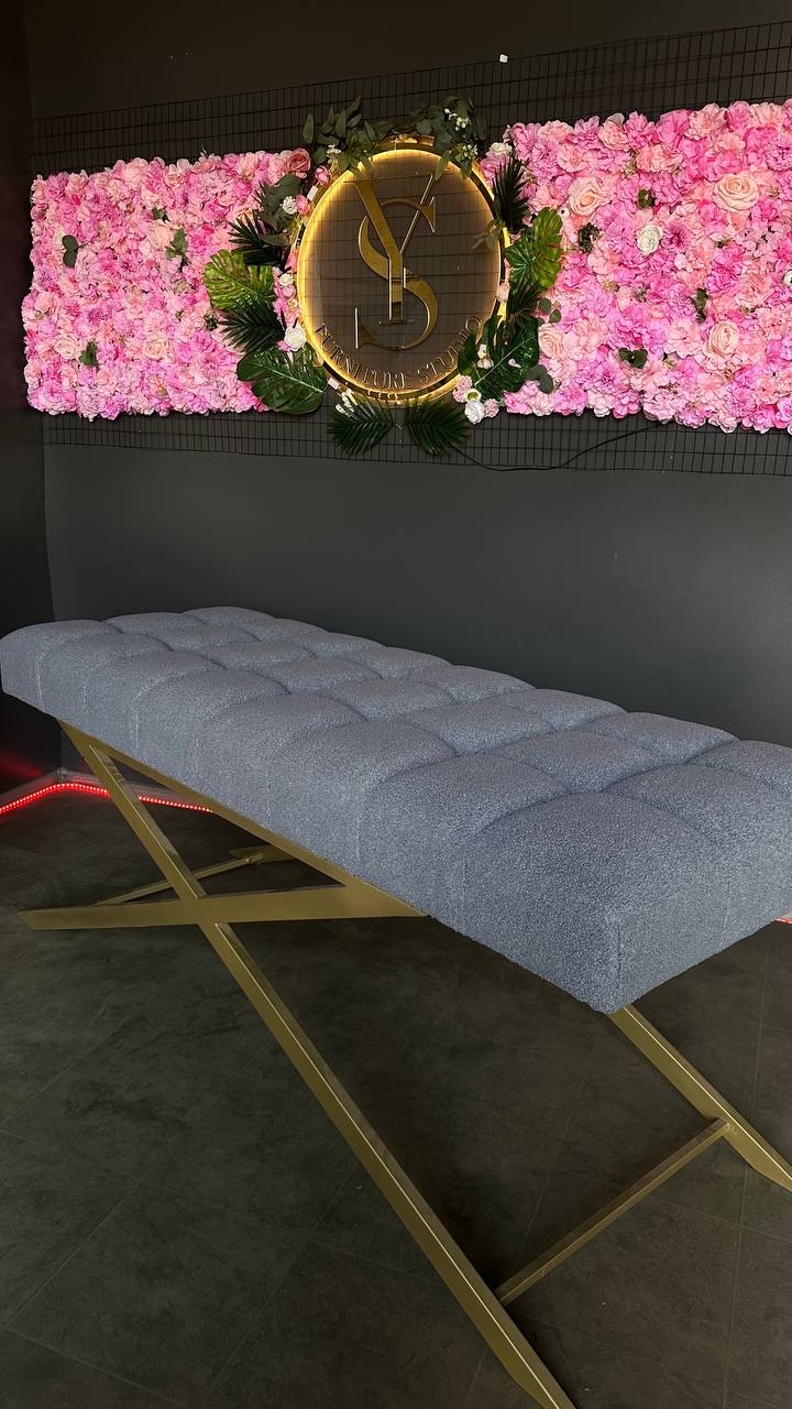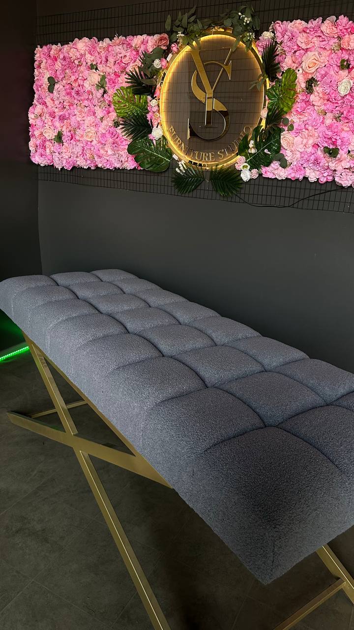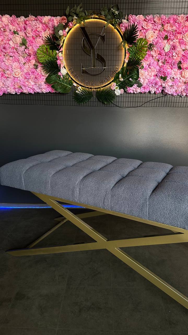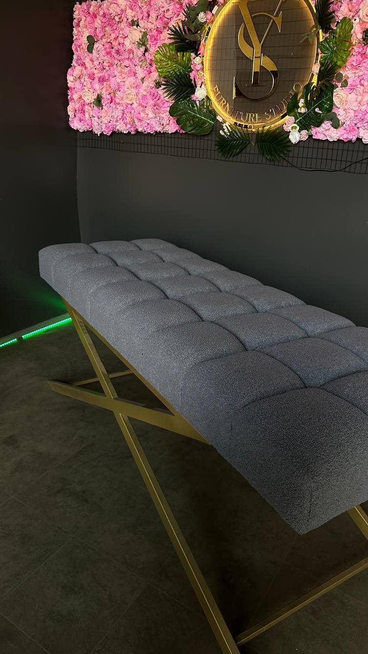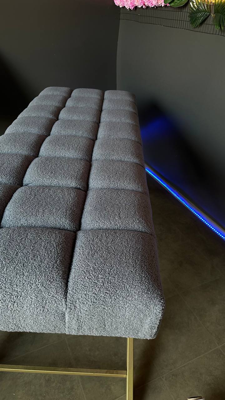 Стильна пряма кушетка з квадратною прошивкою, золотими ніжками та тканиною букле. Ідеальна для салонів краси та майстрів.