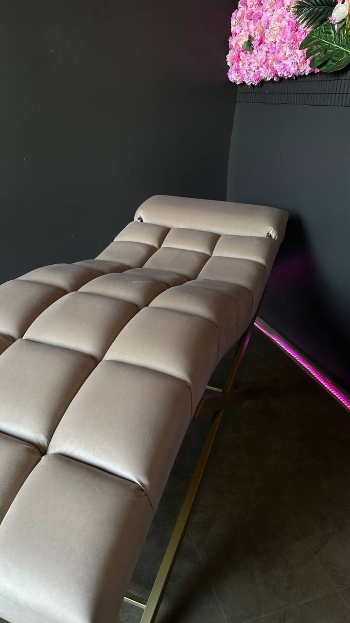 Професійна кушетка Loft із регульованим підголівником, м’якою велюровою оббивкою та золотою основою. Ідеальна для lash-майстрів і салонів краси.