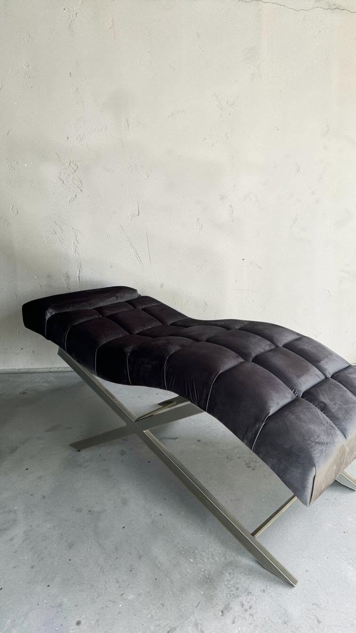 Сучасна кушетка у стилі loft з квадратною прошивкою, регулюванням узголів’я та м’якою велюровою оббивкою сірого кольору.