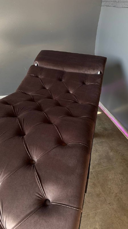 Стильна кушетка у стилі loft з регульованим узголів’ям, каретною прошивкою та оббивкою з коричневого велюру. Ідеальне рішення для салонів краси, студій та сучасних інтер’єрів.
