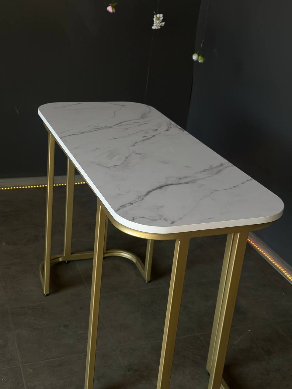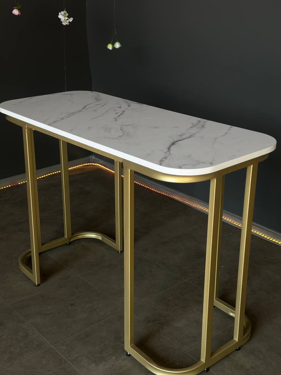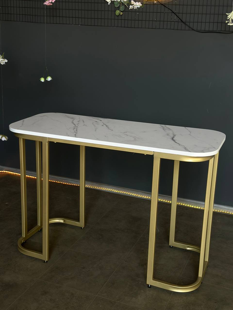 Манікюрний стіл Elegance з металевим каркасом кольору золото та стільницею у кольорі білий мармур. Сучасний та зручний стіл для манікюрних салонів і б’юті-студій.
