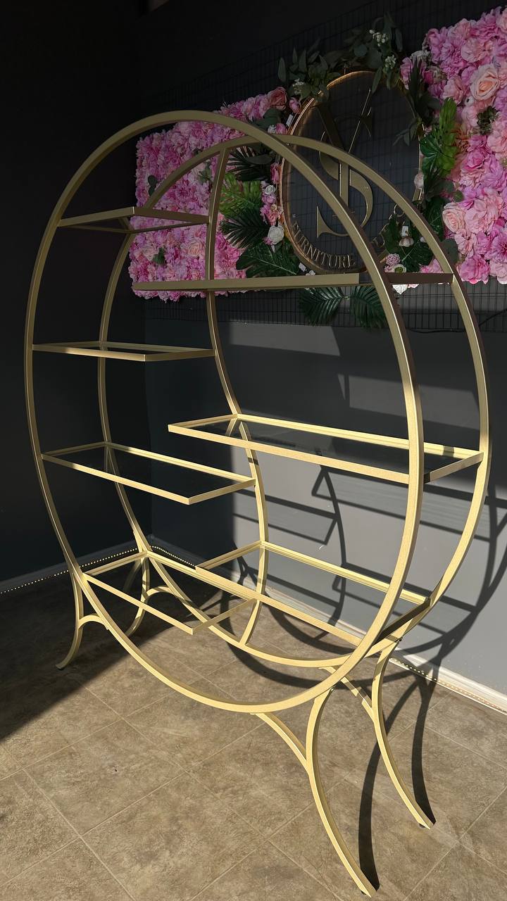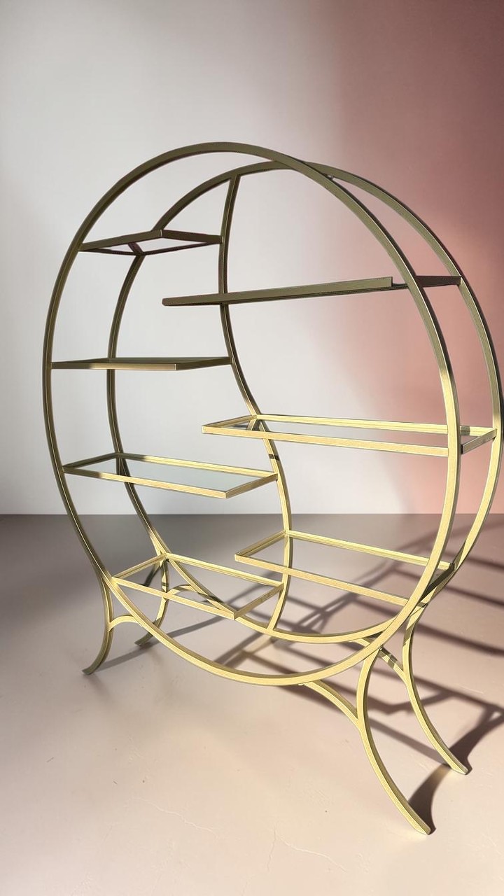 Дизайнерський круглий стелаж у золотому металі зі скляними полицями — стильне рішення для салону або дому.