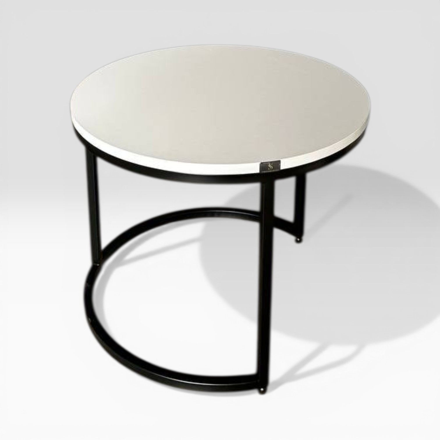 Кругла стільниця з білої плити виглядає легко та елегантно, а чорний металевий каркас додає контрасту та міцності конструкції.