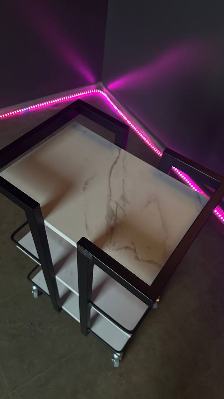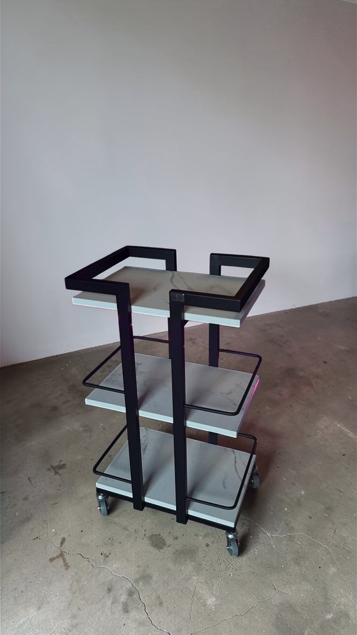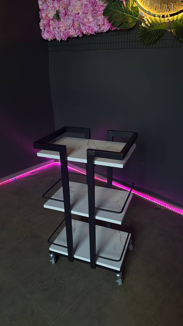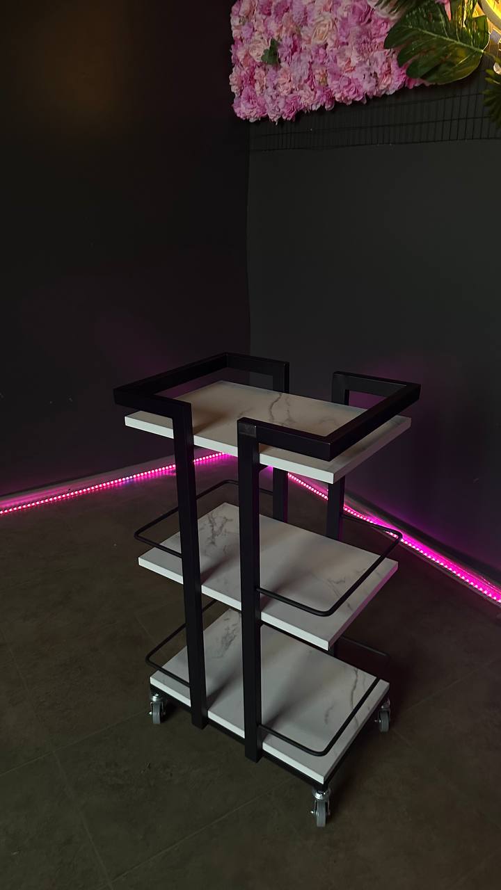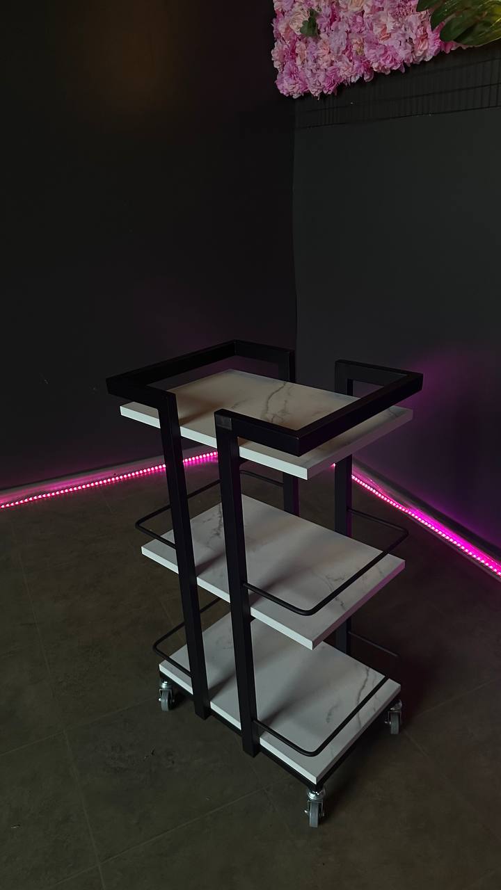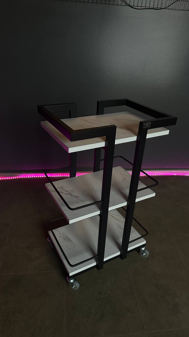 Практичний косметичний візок у чорному металі з полицями під білий мармур. Ідеальний для салонів краси та роботи майстра.