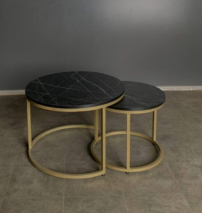 Журнальний столик Loft Double — це стильний комплект із двох круглих столиків з металевим каркасом кольору золото та стільницями у кольорі чорний мармур. Завдяки різним розмірам столики можна використовувати разом або окремо, створюючи зручну та сучасну композицію в інтер’єрі.